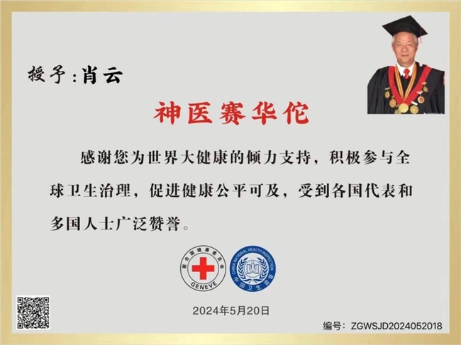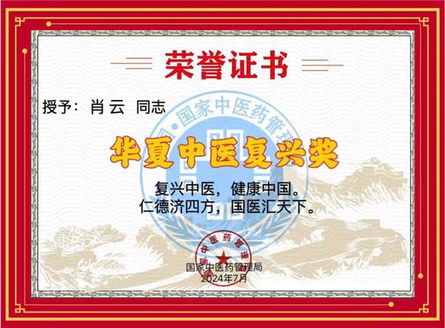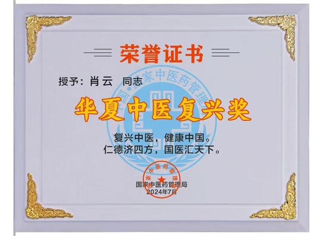 2016年11月被国际中医药联盟,国际中华中医传统医学会,授予国医大师。十二月被中华中医药传承工作委员会授名全国基层肖云名老中医传承工作室。