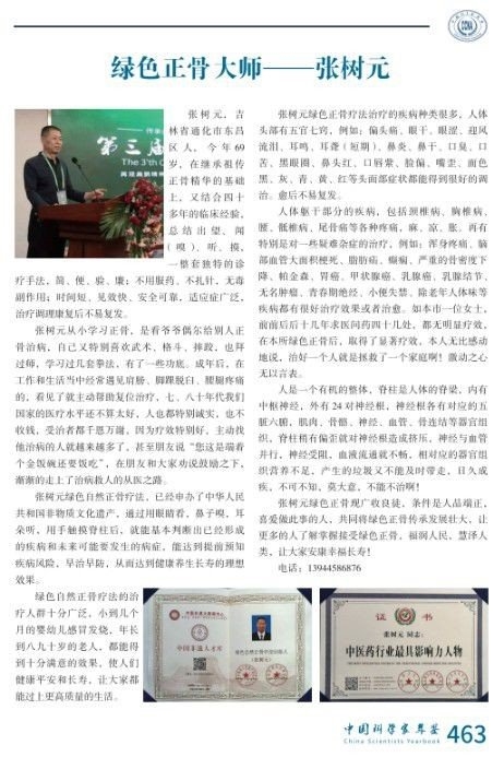 《 名医时报 》( 2026-03-24 第05版:杏林中医) 春风化雨润杏林,妙手仁心承国粹 在第94个“中国国医节”到来之际,我们将目光聚焦于张树元医师。他以几十载的临床实践坚守中医初心,用精湛医术与人文关怀诠释“大医精诚”,成为患者心中的“健康守护者”,更在传承创新中为中医药事业发展注入鲜活力量。 基本信息: 张树元,吉林省通化市人,望诊、摸骨传承人。自幼聪颖好学,跟随爷爷学习绿色自然正骨疗法技能,耳濡目染爷爷的高尚医德,立志把绿色正骨疗法发扬光大,济世救人。爷爷将毕生医技倾囊相授,张树元在传承祖传正骨精华的基础上,结合三十多年的临床经验,总结出一整套独特的诊疗手法,即通过对脊柱的观察和触摸,便能够判断出身体的病痛和未来可能发生的病症,多种慢性病和疑难杂症,也可得到缓解和有效的治疗。张树元大师的绿色自然正骨疗法疗效显著,收费低廉,真正的“花小钱,看大病”,而在20世纪八十年代几乎分文不收,大多都做了公益善举,他的事迹也被广为传颂,多家媒体对其进行了采访和广泛报道,称这位妙手仁心的中医大师为“鬼谷神手”。 早发现脑血栓,糖尿病要及时治疗,早发现早治,小孩儿一定要早治,早治以后就不会得了,以后下一代都不会得了。张老师说,有愿意学习中医的,不打针,不吃药,文化不用太高,都可以学习。学会了,周围的人都能帮助上。不打针,不吃药,效果儿相当好,人就健康了,走出亚健康。中国人的亚健康走不出去,就是因为对这块没有研究的,现在应该走出亚健康,张老师研究40多年,亚健康调养好了很多患者,小孩儿调理完以后,下一辈也不会有糖尿病等常见病,脑血栓就避免了。这些病遗传因素要占到百分之九十多,所以早发现早治疗为了自己更为下一代。 中文名:张树元。 性别:男。 国 籍:中国。 民 族:汉族。 出生地:吉林省通化市。 出生日期:1955年04月。 职称:中医师。 代表成就:绿色自然正骨疗法。 电话:13944586876。 坐诊地址: 吉林省通化市东昌区新站东庆花园A1号。 张树元——绿色正骨疗法的创新者与传承人,在中医的广袤天地中,以其独特的治疗方式和理论,在现今的医学领域闪耀出独树一帜的光芒。他的疗法不仅承袭了家族几代人对正骨治疗的深厚积淀,更在现代医学和中医理论的交汇点上,将气功与正骨手法相结合,形成了独具特色的“绿色正骨疗法”,为众多患者带来了不打针、不吃药即可断根的康复体验。 一、家族传承与创新精神 张树元所掌握的正骨手法源自于家族的传承,但这并未局限他的脚步。正如中医学一贯强调的“守正创新”,张树元在继承家族传统的同时,勇于打破桎梏,不断探寻新的治疗路径。他将家族传承的正骨技艺与气功功法完美结合,赋予了绿色正骨疗法更强的临床疗效。气功作为中医养生、治疗的一部分,其调理气机的功能在张树元的手法中被充分发掘和发挥。通过气功的辅助,张树元的手法不仅精妙,而且效果显著,可以使患者在短时间内感受到身体气血的流动和经络的疏通,从而迅速恢复健康。 在张树元的学医历程中,他始终认为学习和掌握正骨技艺并没有特别的困难。关键在于,医者应当具备“正气”。他曾多次强调,只有拥有正气的人,才能够真正理解并掌握正骨疗法的精髓。所谓正气,不仅指身体的健康状态,更是一种精神层面的纯净和专注。这种信念在他治疗过程中体现得淋漓尽致。每一次治疗,他都会用自己深厚的内力和专注的气功,将患者身体中的气机调动起来,从而实现疗效上的突破。 二、理论基础:“万病调脊柱” 张树元的治疗理论可谓深刻而独到,其核心便是“万病调脊柱”。这一理论深受《黄帝内经》中“脊者,身之大柱”的启发。张树元认为,脊柱是人体的核心部位,脊柱问题的产生会导致气血不通,五脏六腑的气机也因此受到影响,从而引发各种疾病。通过对脊柱的调理,尤其是对督脉的疏通,可以达到调节气机、恢复五脏平衡的目的,进而治愈各种疾病。 绿色正骨疗法在实践中验证了这一理论的有效性。许多患者在接受张树元的治疗后,不仅原有的疾病得到了缓解,甚至一些顽疾也在调理脊柱后得以根治。张树元特别指出,督脉是人体阳气汇聚的通道,其上分布着大量与五脏六腑息息相关的穴位。通过对这些穴位的调理,不仅能够疏通气血,还能使人体的内循环系统得以恢复正常运作。随着气机的畅通,人体的“小轮子”运转起来,气血充盈,筋骨强健,身体自然便恢复了健康。 张树元的治疗不仅仅局限于单一病症的消除,他更注重整体健康的恢复。对于他而言,疾病的治疗应该从根本上着手,而非治标不治本。因此,他提出了“断根”的概念,强调通过调理脊柱和督脉,能够彻底根治许多顽疾。这种独特的治疗方式,使得绿色正骨疗法成为了一种不同于传统治疗的、更加彻底的疗法。 三、绿色正骨疗法的独特性 绿色正骨疗法之所以独特,首先在于它是一种完全不依赖外部药物和器械的治疗方式。张树元的治疗过程完全通过双手的手法和气功的调动,来达到疗效。与传统的中医治疗方法相比,绿色正骨更加注重通过自然的方式来恢复人体的内在平衡。这种“不打针、不吃药、不食疗”的治疗方式,无论是对于身体虚弱的患者,还是对于长期服用药物导致肝肾损伤的患者,都是一种极其安全的治疗选择。 此外,张树元的手法操作极其精细,讲究轻柔